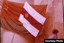 Пачатак нечарговай сэсіі Вярхоўнага Савету 12 скліканьня, на якой была абвешчана незалежнасьць Беларусі, 24 жніўня 1991 г. (са сьцягам – Валянцін Голубеў, Зянон Пазьняк, Вольга Галубовіч).