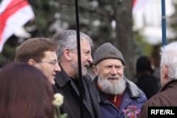 Алесь Лагвінец (другі зьлева), правей — Аляксандар Мілінкевіч размаўляюць з удзельнікамі акцыі.