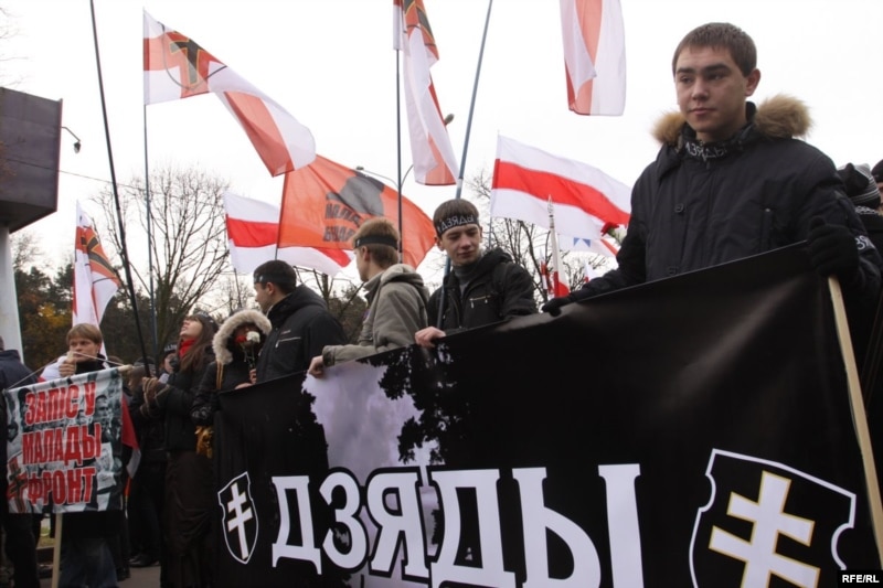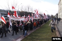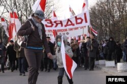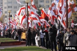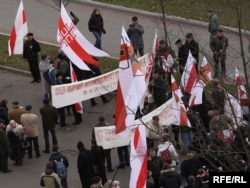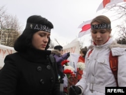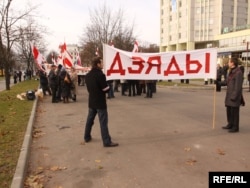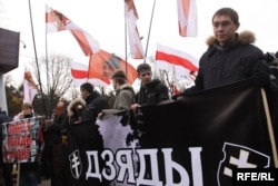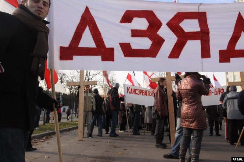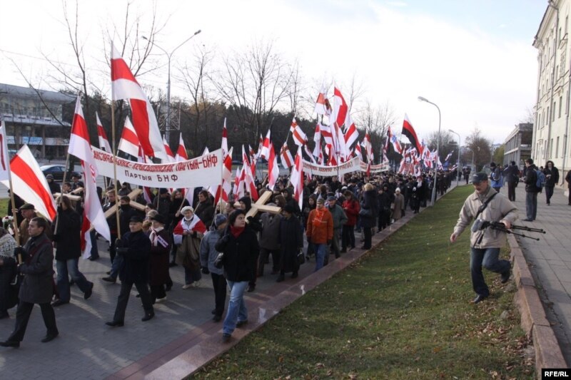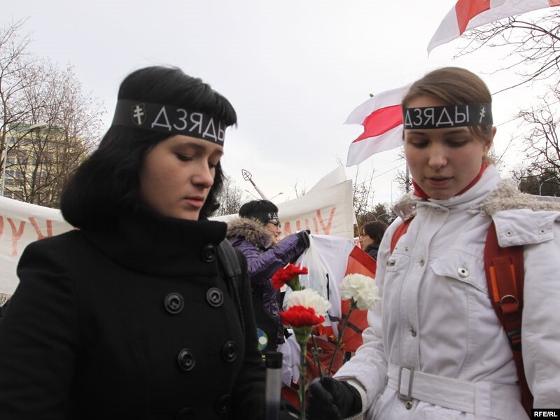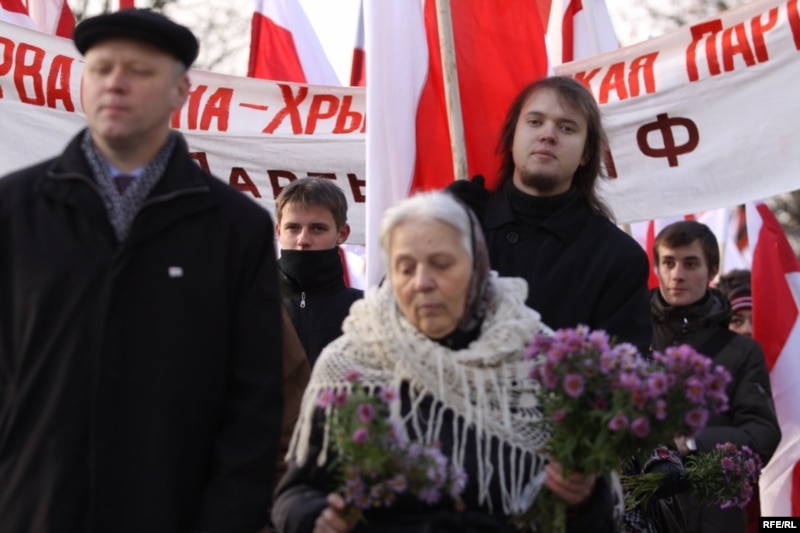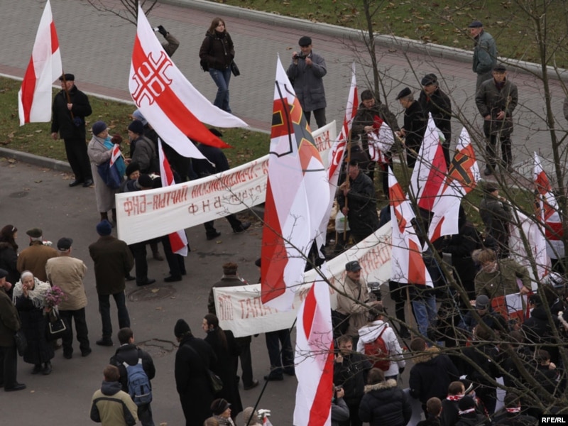 На месцы збору — два дзясяткі чалавек, пераважна моладзь. Удзельнікі акцыі трымаюць расьцяжкі “Дзяды”, “Малады фронт”, “Кансэрватыўна-хрысьціянская партыя БНФ”. Лунаюць бел-чырвона-белыя сьцягі.