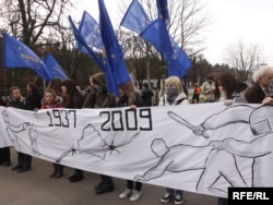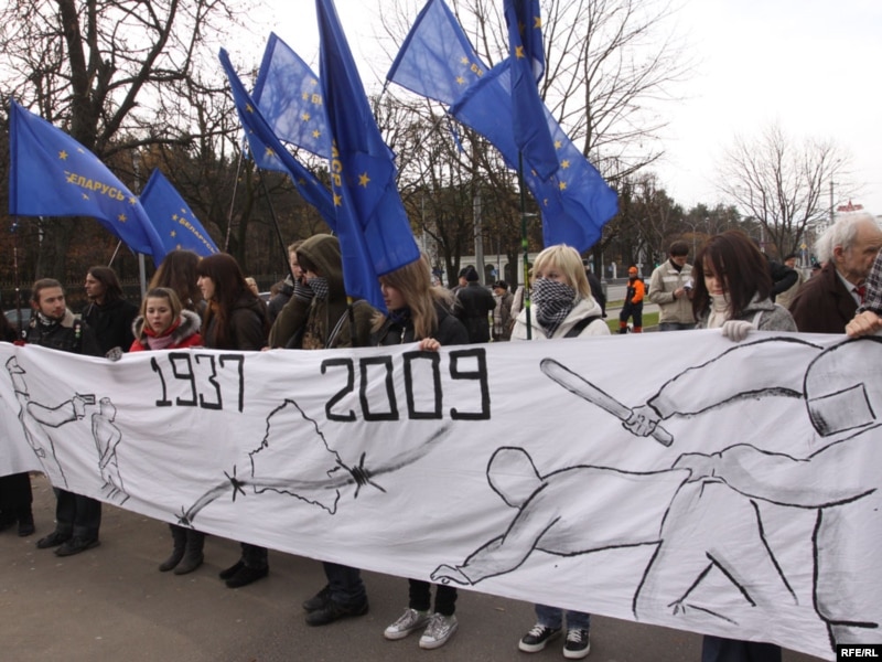 Зьявілася новая расьцяжка “Маладая Беларусь памятае”, а таксама плякат з выявамі Сталіна і Лукашэнкі і гадамі “1937, 2009”.
