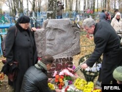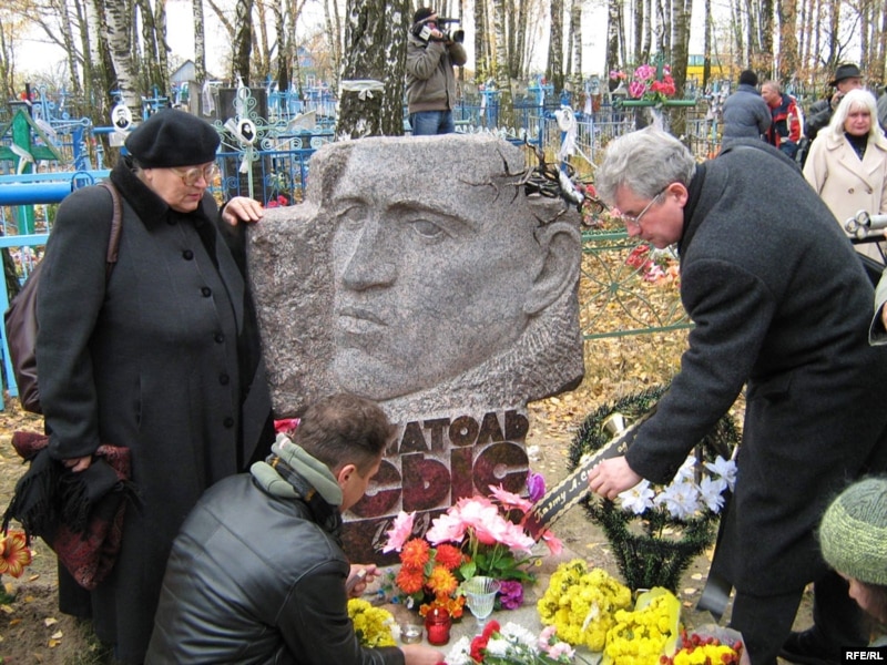 На магіле Сыса яго сястра Тамара, Эдуард Акулін, Леанід Дранько-Майсюк ускладае вянок.