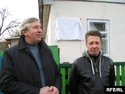 Скульптар Павал Лук і Эдуард Акулін адкрываюць мэмарыяльную шыльду.