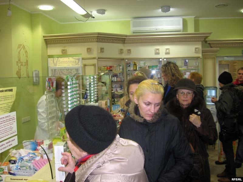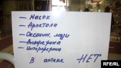 Спадарыня: “Не. Ні масак няма, ні рэмантадыну, арпітол заканчваецца, застаецца толькі дзіцячы. Аксалінавай мазі таксама няма — нічога няма. Гэта толькі па тэлевізары кажуць, што ўсё ёсьць у аптэках. І гэта — дзяржаўная аптэка”.