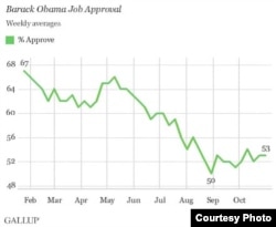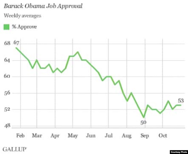 Паводле аўтарытэтнай сацыялягічнай службы Гэлап, назіраецца падзеньне рэйтынгу Абамы. У кастрычніку ягоную дзейнасьць на пасадзе прэзыдэнта падтрымлівалі 53 адсоткў (у лютым гэтая лічба была 69 адсоткаў), нэгатыўна да дзейнасьці Абамы ставіцца 41 адсотак апытаных (адразу пасьля інаўгурацыі было 12 адсоткаў). Ніжэй – графік падтрымкі паводе Гэлапа.