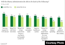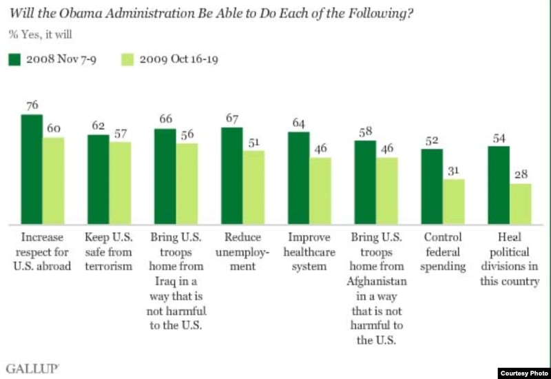 Год таму Барак Абама быў абраны 44-м прэзыдэнтам Злучаных Штатаў Амэрыкі. Заступіўшы на пасаду прэзыдэнта, Абама меў рэкордны рэйтынг падтрымкі амэрыканцаў – 79%.