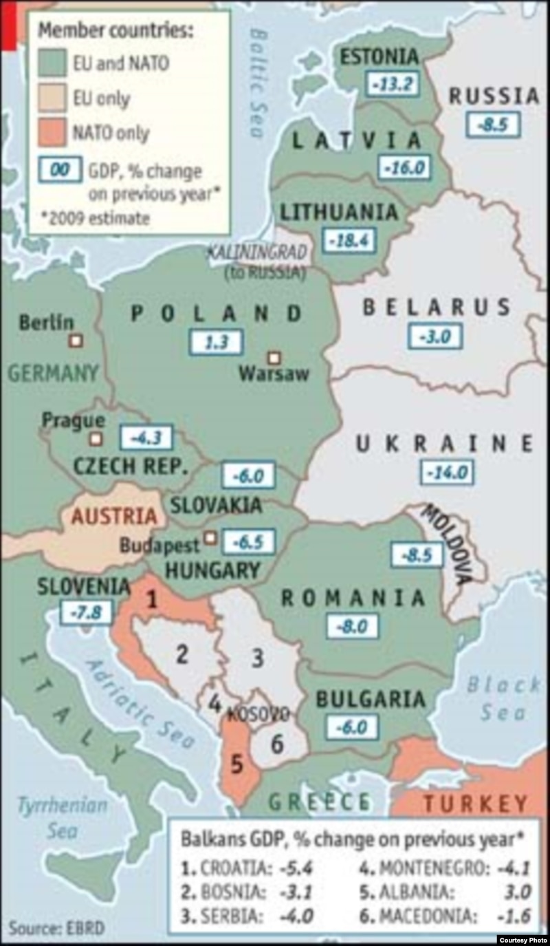 Зьмяненьне валавага ўнутранага прадукту (ВУП) былых камуністычных краінаў Эўропы ў 2009 годзе ў параўнаньні зь мінулым годам (The Economist)