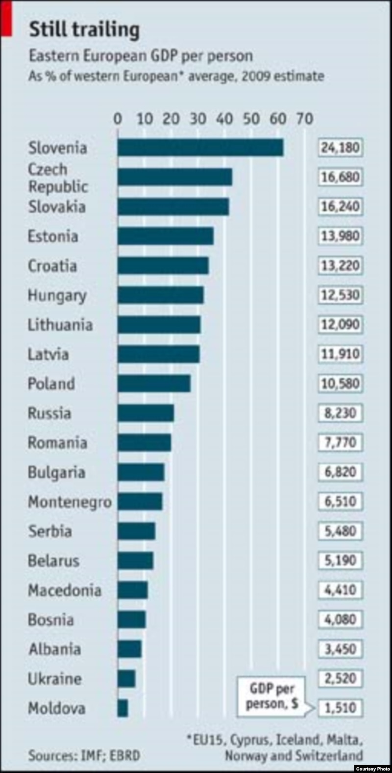 Да 20-годзьдзя падзеньня бэрлінскай сьцяны штотыднёвік The Economist апублікаваў артыкул “Памятайма пра сьцены”, дзе падае лічбы па валавым унутраным прадукце (ВУП) былых камуністычных краінаў Эўропы за 2009 год.