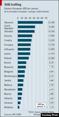 Валавы унутраны прадукт (ВУП) былых камуністычных краінаў Эўропы за 2009 год (The Economist)