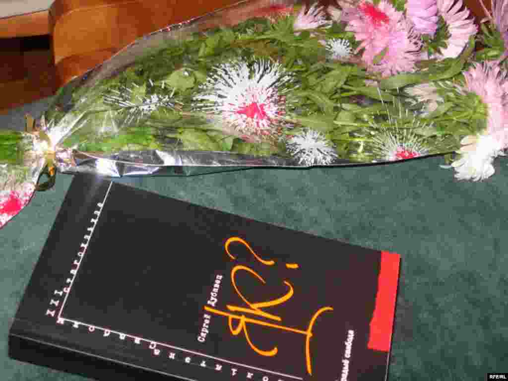 Дырэктар беларускай службы Радыё Свабода Аляксандар Лукашук дорыць кнігі гасьцям.