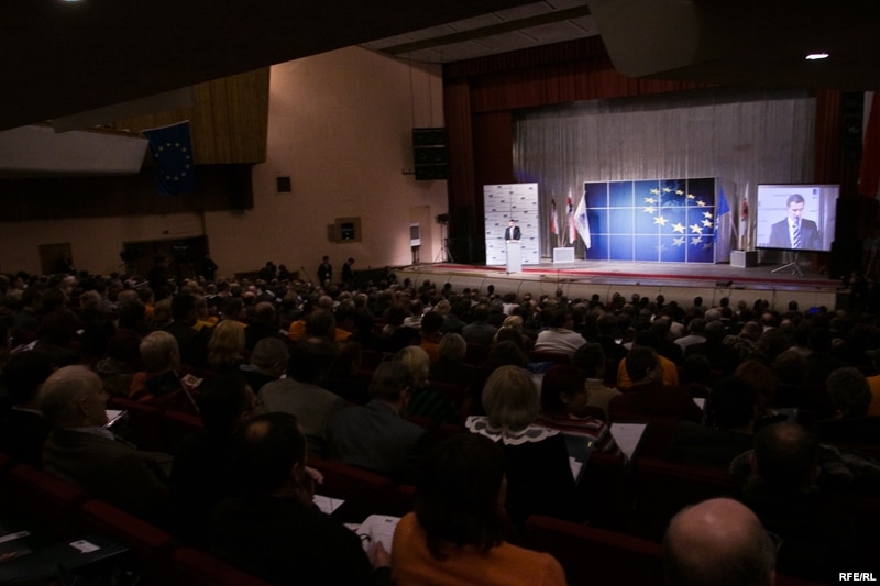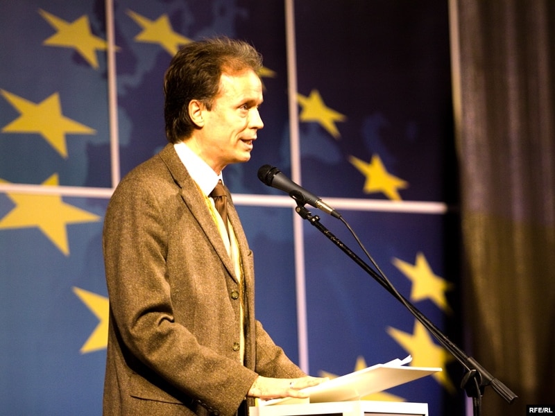 12.25 Большасьць папярэдніх выступоўцаў прамаўлялі па-ангельску. Памочнік Аляксандра Мілінкевіча Алесь Лагвінец, сынхронна перакладаў на беларускую мову. Жан Дамінік Джуліяні, старшыня Фонду імя Рабэра Шумана, прамаўляў па-француску. Яго сынхронна перакладаў таксама Лагвінец.