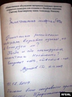 У кнізе водгукаў пакуль што запісаў усяго пяць. І ўжо тры зь іх — гэта пратэст грамадзкасьці Віцебску супраць усталяваньня помніка Аляксандру Неўскаму. Ёсьць, да прыкладу, такі запіс: «Помнікі расейскім князям, мажліва, і патрэбныя, але ці ў Беларусі? Дзе і калі плянуецца паставіць помнік Касьцюшку? Пытаньні ёсьць, адказаў няма».