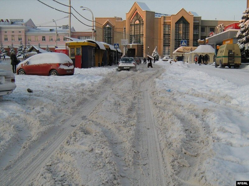Прывакзальная плошча у Гомелі пасьля сьнегападу