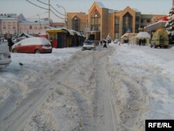 Дворнікі змагаюцца са сьнегам на вуліцы Курчатава