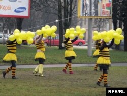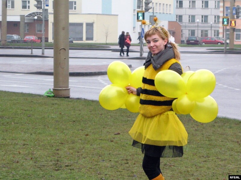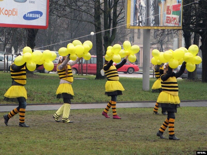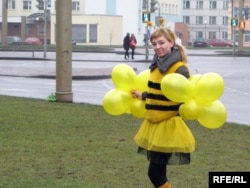 Дзяўчаты-"пчолы" з БРСМу рэклямуюць мёд на сьнежаньскім кірмашы ў Горадні