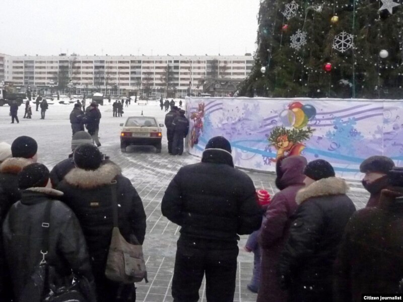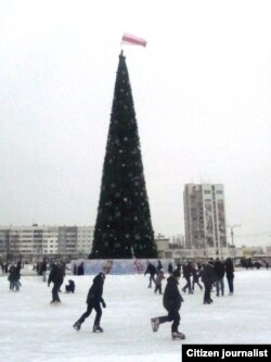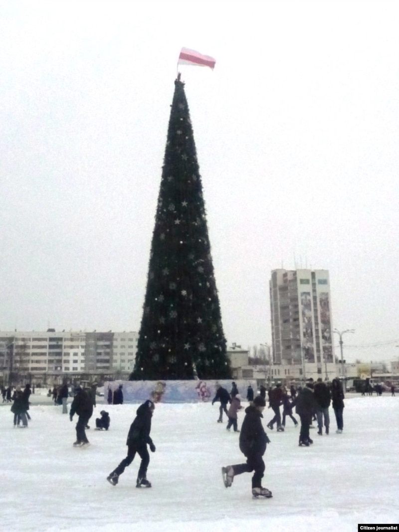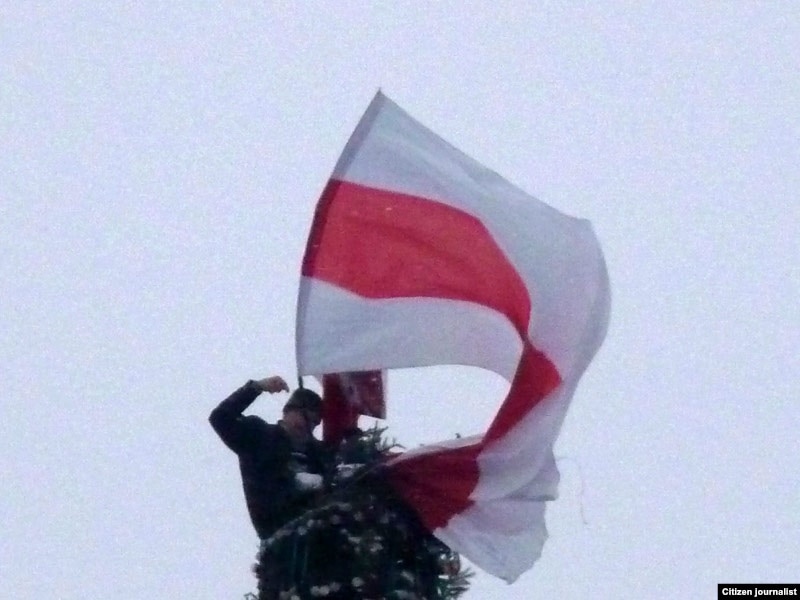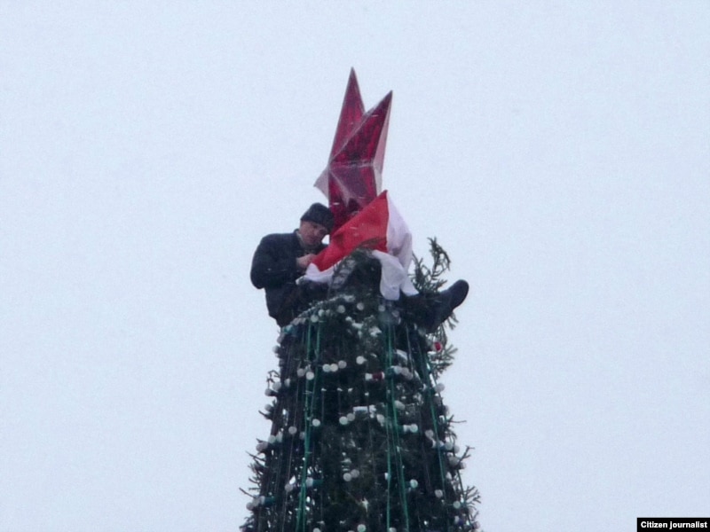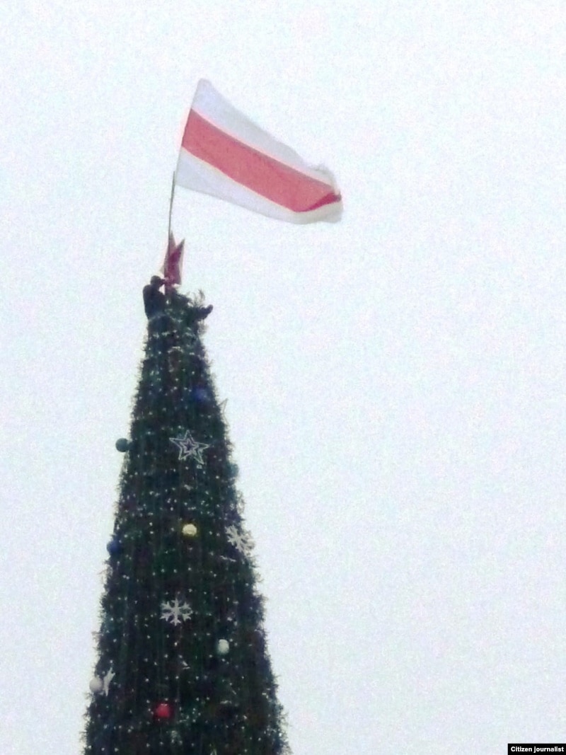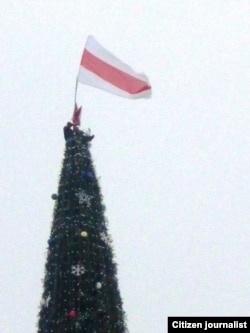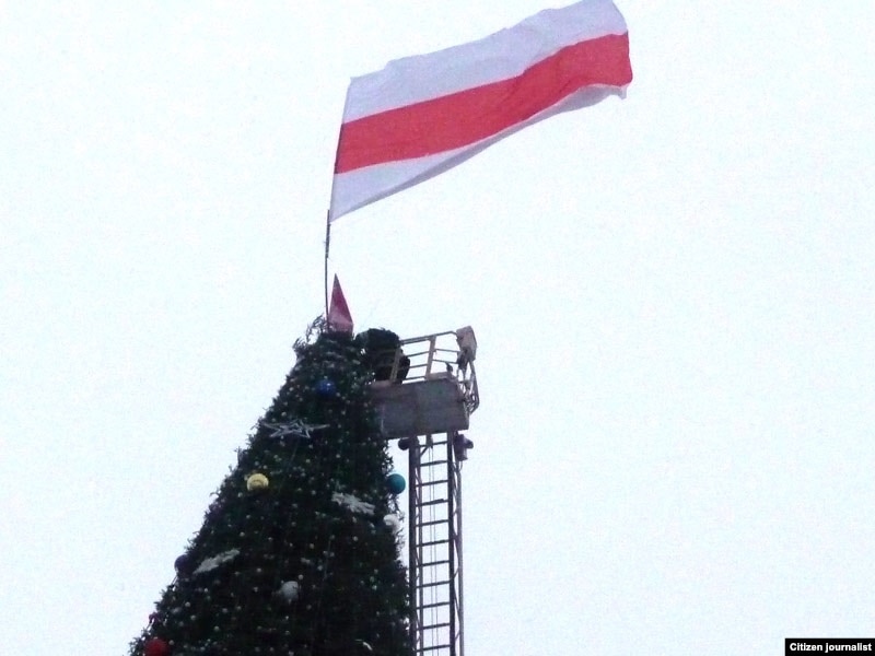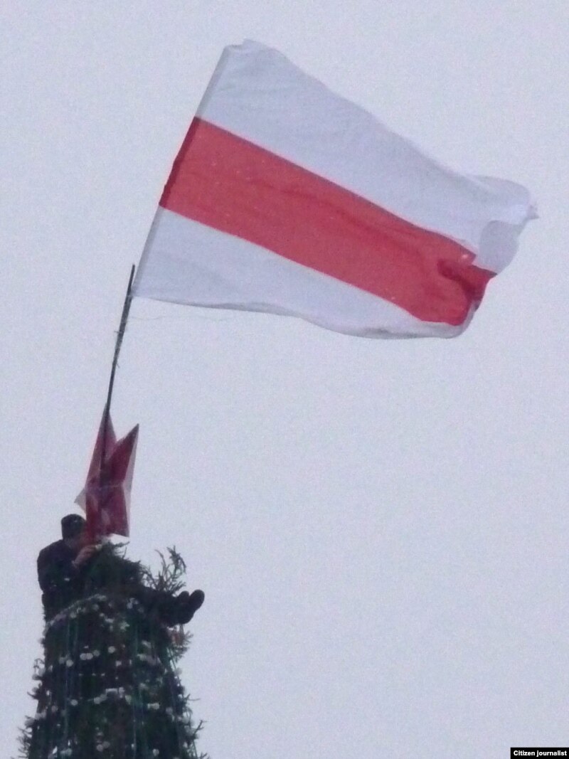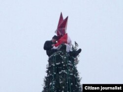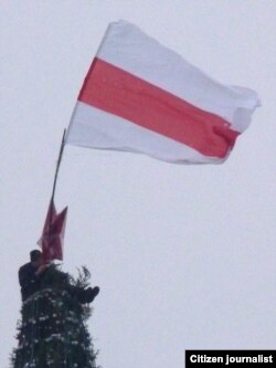 Яму ўдалося зьняць, як Сяргей Каваленка вывешвае бел-чырвона-белы сьцяг, як сьцяг здымаюць супрацоўнікі МНС, а таксама як актывіста затрымліваюць міліцыянты.