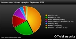 Колькасьць карыстальнікаў інтэрнэту па рэгіёнах сьвету ў 2009 годзе.