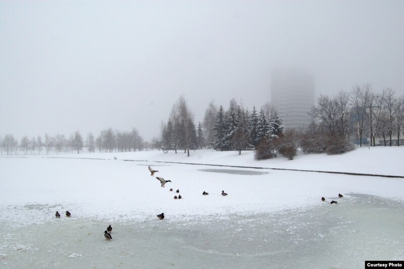 Мінск, зіма 2009. Сьляпянская водная сыстэма насупраць Нацыянальнай бібліятэкі. Гэтыя качкі жывуць у мікрараёне “Ўсход”, начуюць пад мосьцікамі “зялёнай зоны”