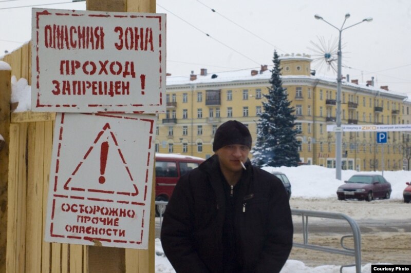 Віцебск, зіма 2010. Невядомы праходзіць па прывакзальнай плошчы. Вакзал, дзе зусім нядаўна яшчэ заставаліся вітражы з Пагоняй, зараз разьбіраюць і рамантуюць