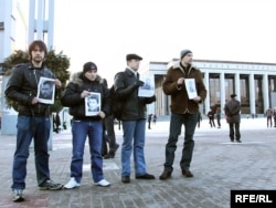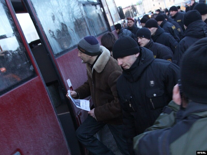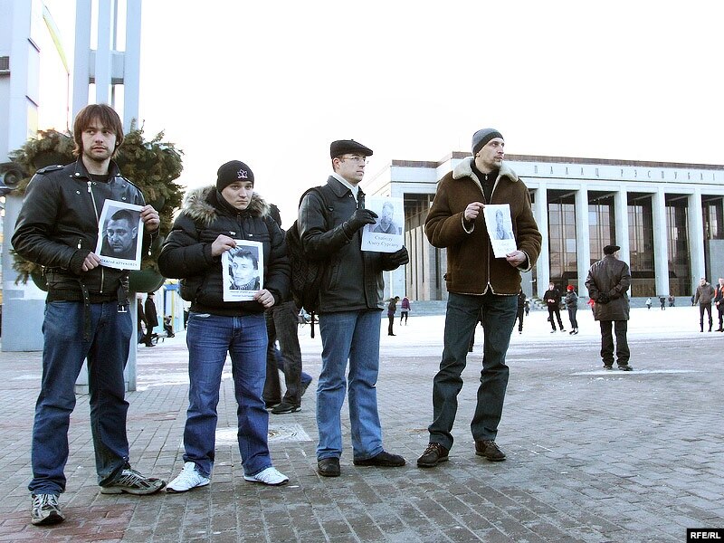 18:15 На плошчу выйшлі чацьвёра актывістаў. Яны трымалі партрэты Мікалая Аўтуховіча, Уладзімера Асіпенкі і Алега Сургана. Яны прастаялі каля пяці хвілінаў. Міліцыянты папярэдзілі, што акцыя іх незаконная, каб яны разыходзіліся. Актывісты засталіся стаяць. Тады пад’ехаў міліцэйскі аўтобус, спыніўся літаральна за сьпінамі ўдзельнікаў. Іх зацягнулі ў міліцэйскі аўтобус і адвезьлі ў пастарунак.