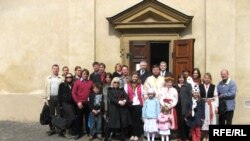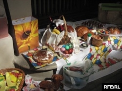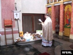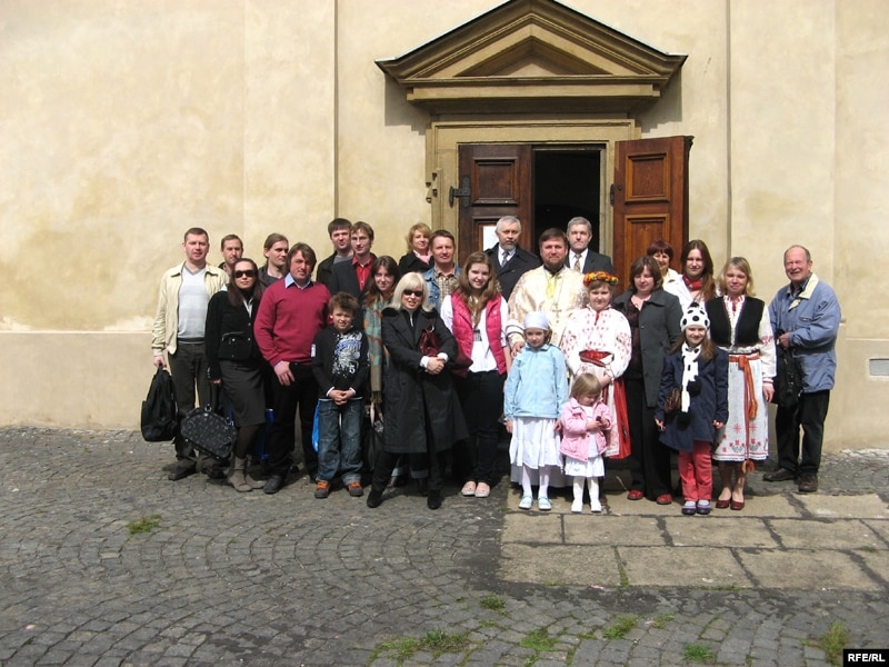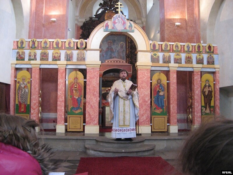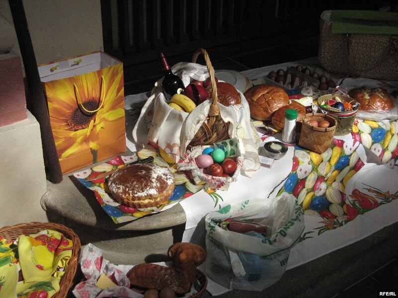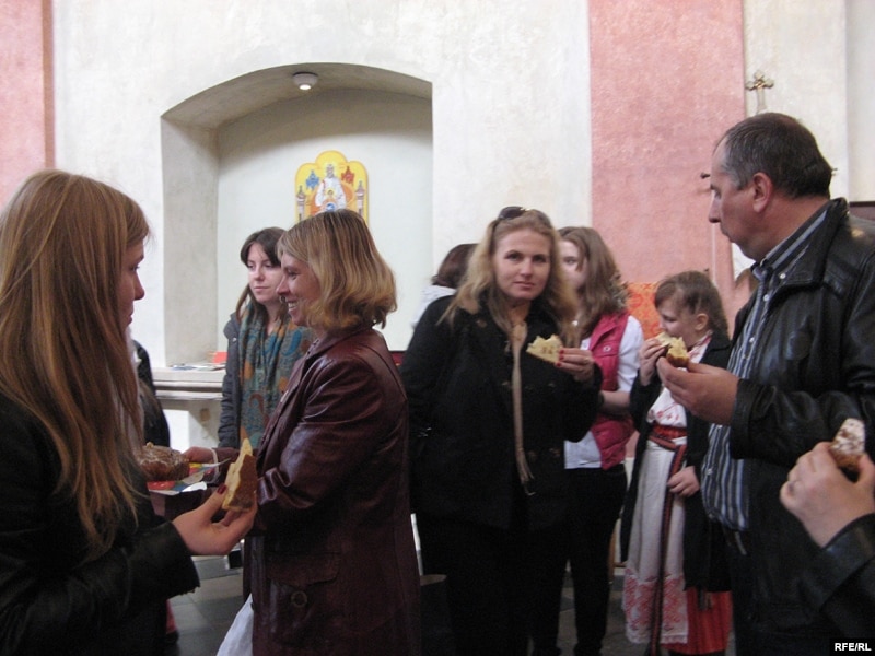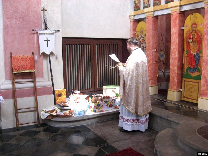 Праскія беларусы сабраліся на велікодную службу і асьвячэньне пасхаў у царкве сьвятых Кузьмы і Дзям’яна, заснаванай у 928 годзе. Службу адслужыў уніяцкі сьвятар айцец Андрэй Абламейка.