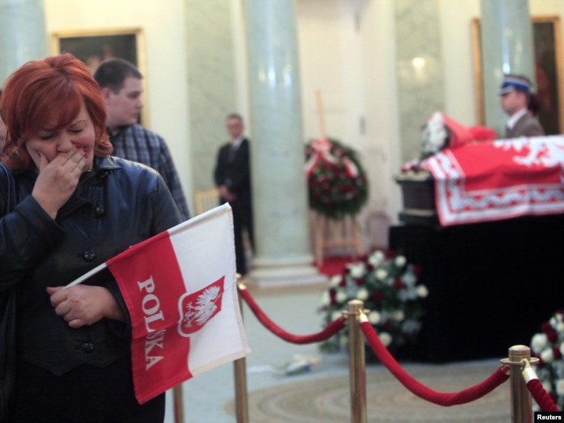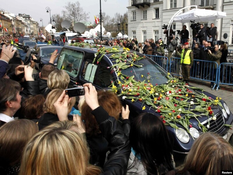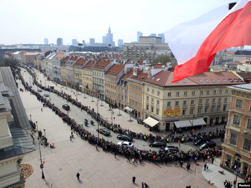 Па ўсё краіне працягваюцца жалобныя набажэнствы, людзі зьбіраюцца на плошчах, каля помнікаў з кветкамі і зьнічкамі, каб ушанаваць памяць тых, хто загінуў 10 красавіка на двойчы цяпер праклятай для палякаў зямлі – у катыньскім лесе.