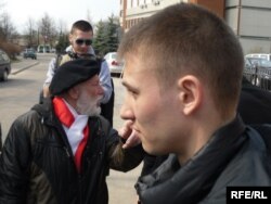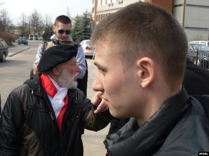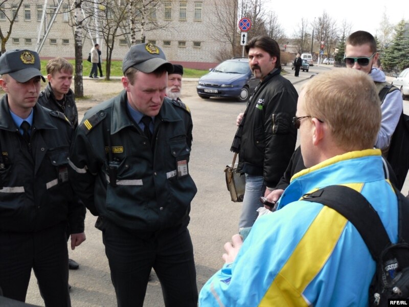 Да спрэчкі зь міліцыянтамі далучыўся і віцебскі апазыцыянэр Барыс Хамайда. Ён заўважыў, што каля дзесятка хлопцаў у падобных чорных куртках увесь час замінаюць журналістам рабіць здымкі.