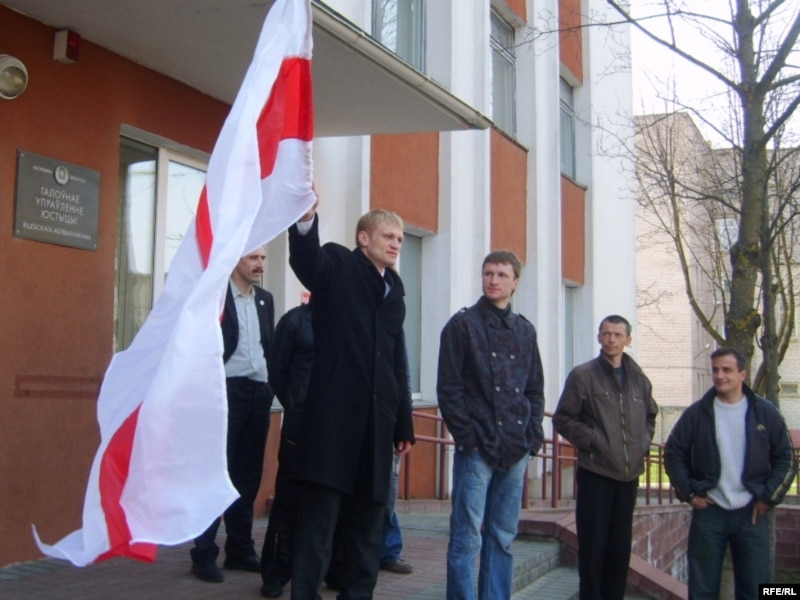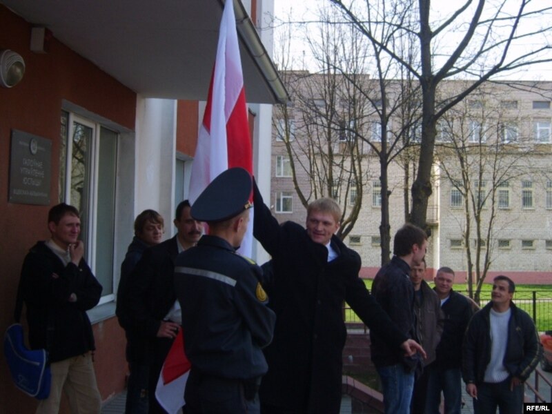 Сяргей Каваленка, падыходзячы да судовага будынка, нечакана для ўсіх дастаў ды разгарнуў бел-чырвона-белы сьцяг і ўзышоў зь ім на ганак. Прысутныя адгукнуліся на ягоны вокліч «Жыве Беларусь!», а дзяжурны міліцыянт пачаў сьпешна выклікаць падмацаваньне. Неўзабаве каля суду зьявілася адразу некалькі службовых машын, зь якіх павыходзілі міліцыянты і людзі ў цывільным.