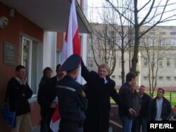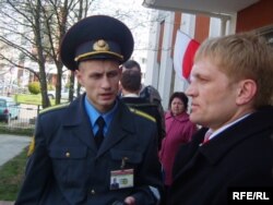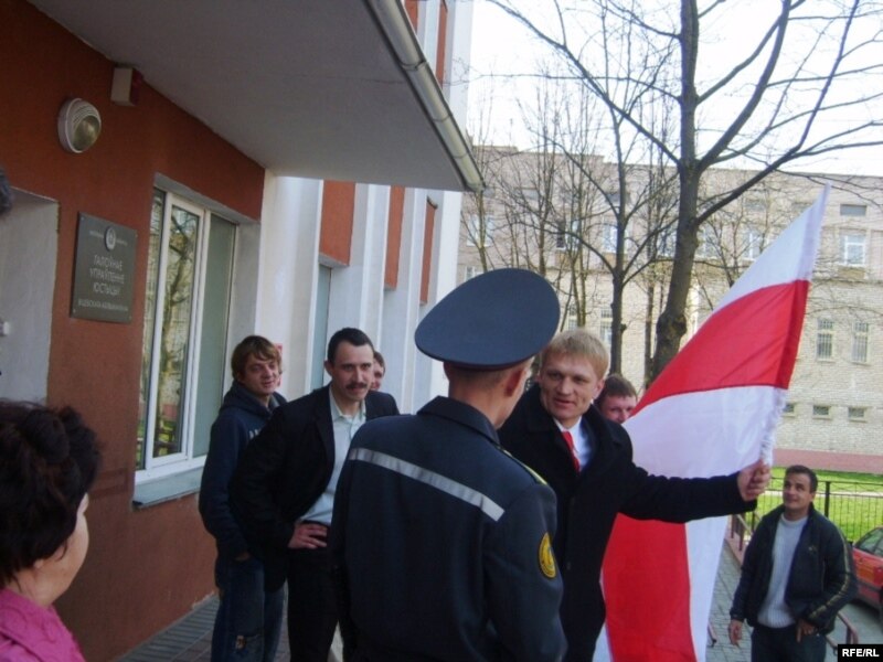 Сяргею Каваленку загадалі згарнуць сьцяг, але ён не пагадзіўся і павесіў яго перад уваходам у суд. Міліцыянты сарвалі нацыянальны сымбаль, і тады Сяргей Каваленка зноў яго ўзьняў:
