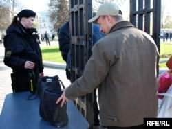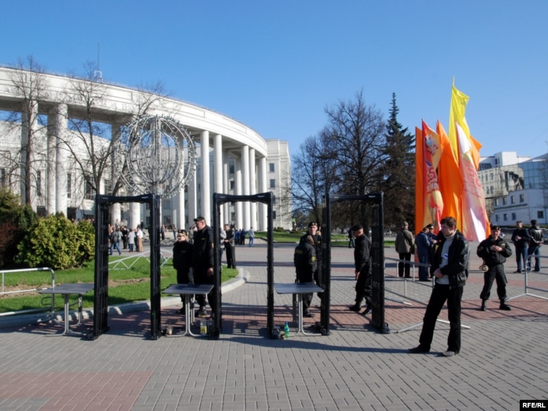17.40 Плошча перад Нацыянальнай акадэміяй навук агароджаная па пэрымэтры. Усталяваныя 6 прапускных рамак. Ля іх стаяць ахоўнікі зь ліку арганізатараў. Яны тлумачаць людзям, навошта патрэбны дагляд. Ва ўсіх правяраюць асабістыя рэчы. У журналістаў — тэхніку. Празь іх мала хто праходзіць.