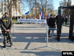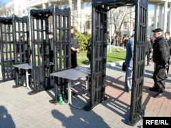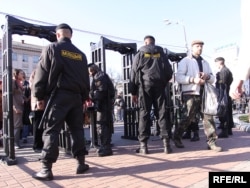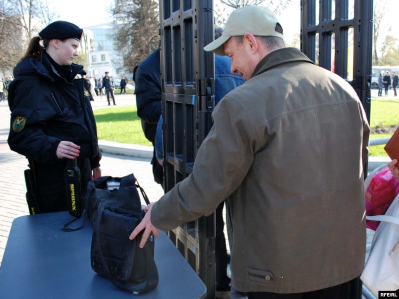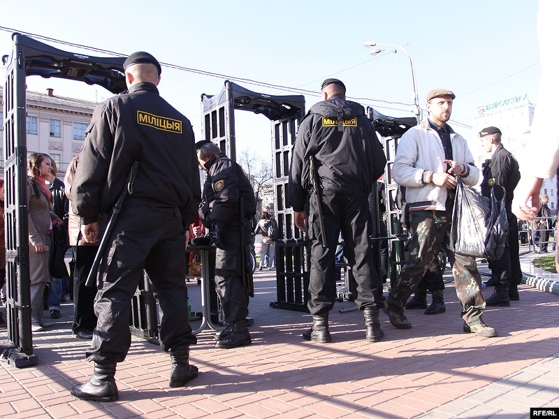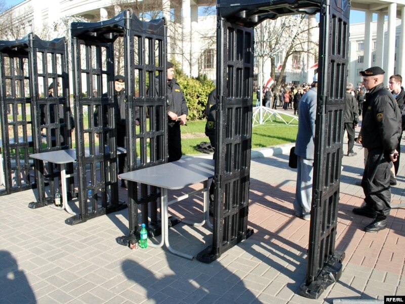 Яшчэ адна асаблівасьць: удзельнікі акцыі праходзяць на месца збору праз мэталашукальнікі. Усё падыходы да Акадэміі навук абгароджаныя турнікетамі, у трох месцах усталяваныя па 3 рамкі мэталашукальнікаў. Каля кожнай рамкі — па 3-4 міліцыянты. Даглядаюць кожнага, хто праходзіць, — асабісітыя рэчы, кішэні. Даглядаюць таксама журналістаў, правяраюць тэхніку. Гэта досыць марудная працэдура, людзі ўсё яшчэ праходзяць.