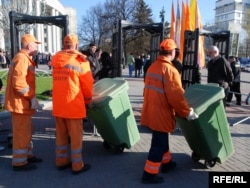 17.55 Супрацоўнікі камунальных службаў прывезьлі на плошчу вялікія кантэйнэры для сьмецьця. Кантэйнэры ставяць такім чынам, каб людзі не маглі патрапіць за агароджу.