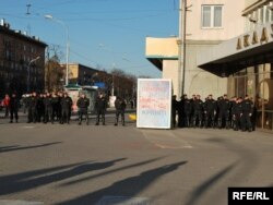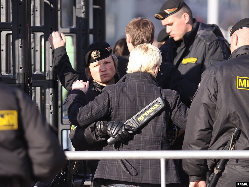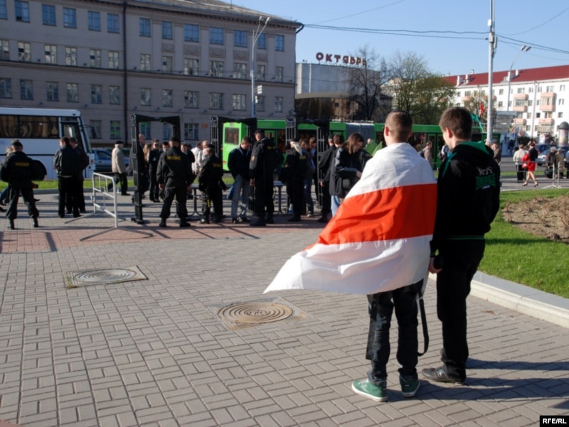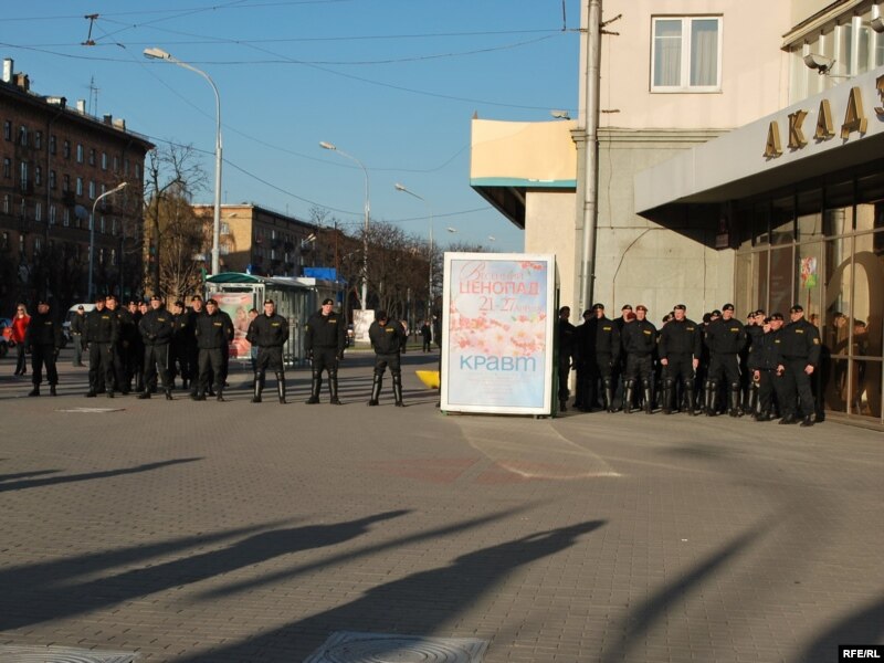 Дадам, што калі людзі рухаліся па праспэкце Незалежнасьці, то ля «Акадэмкнігі» пры павароце на Сурганава, іх спыніў атрад спэцназу. Хаця да пачатку арганізатары гаварылі, што яны дэкляруюць максымальна мірны ход акцыі, тым ня менш яна праходзіць пад узмоцненым кантролем супрацоўнікаў міліцыі.
