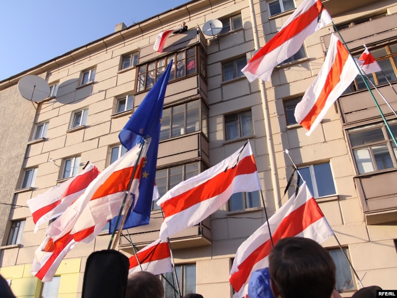 19.20 На вуліцы Сурганава з гаўбца пятага паверху ўдзельнікаў «Чарнобыльскага шляху» вітала дзяўчына зь бел-чырвона-белым сьцягам. Гэта выклікала ажыўленьне ў шэрагах дэмантрантаў.
