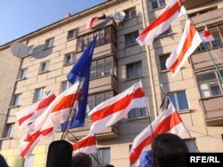 17.55 Людзей сабралася некалькі дзясяткаў чалавек. Зьявіліся бел-чырвона-белыя сьцягі з чырвонымі стужкамі.