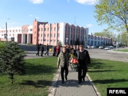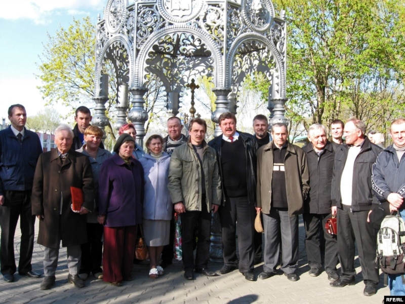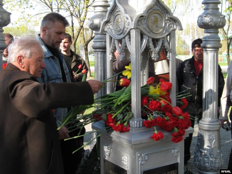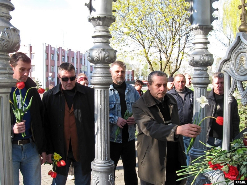 Сяргей Калякін і Анатоль Лябедзька разам з актывістамі ўскладваюць вянкі й жывыя кветкі да чарнобыльскай каплічкі ў Гомелі.