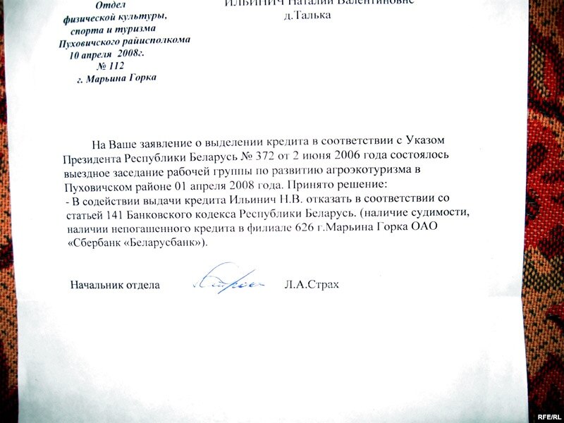 Ільініч: «Першая адмова і была ў рабочай групе па экатурызьме — як быццам, у раёне ёсьць прадстаўнікі райвыканкаму, банку і грамадзкай арганізацыі „Адпачынак і вёска“. Я разумею, што ёсьць толькі райвыканкам, які прымае рашэньне. Во прычына — „у вас судзімасьць, і бізнэс-плян ня мае дакладнай накіраванасьці ў сфэры экалёгіі і турызму“. А дзе ў раёне яшчэ ёсьць „зялёны маршрут“?! Зьвярнулася ў адміністрацыю прэзыдэнта — „у службе бясьпекі „Аграпрамбанку“ ёсьць інфармацыя, якая вам не дазваляе ўзяць крэдыт“. А „судзімасьць“ у мяне ўжо зьнятая — прайшло паўтара гады. І ўсё — грошы ўкладзеныя, і зарплата ўся ідзе на выплату працэнтаў. Каб не карова, з голаду б памерлі — жывем за кошт продажу малака...»