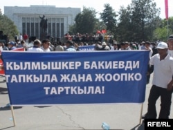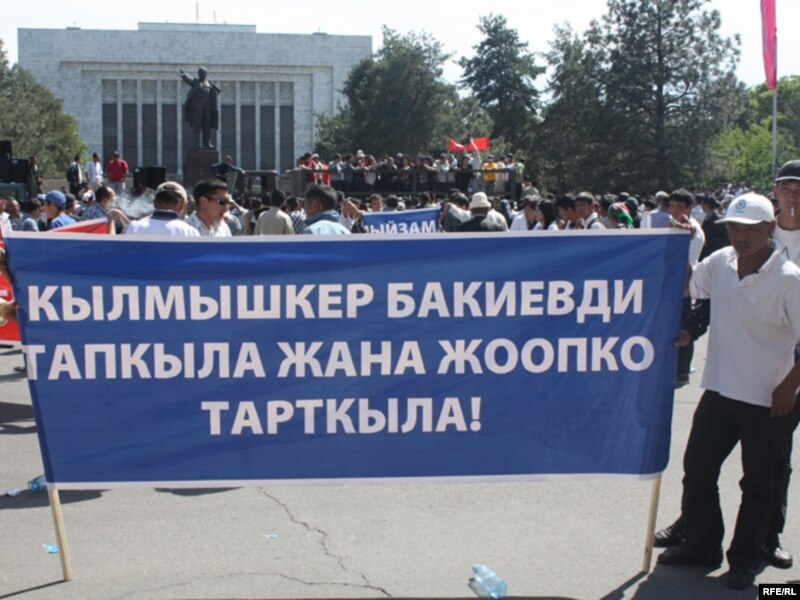 Сьпярша на Старой плошчы кіргіскай сталіцы каля пяці тысяч мітынгоўцаў выказалі незадаволенасьць няздатнасьцю часовага ўраду навесьці ў краіне парадак і дамагчыся вяртаньня ў Кіргізстан Бакіева і суду над ім.