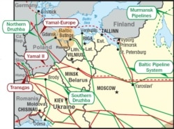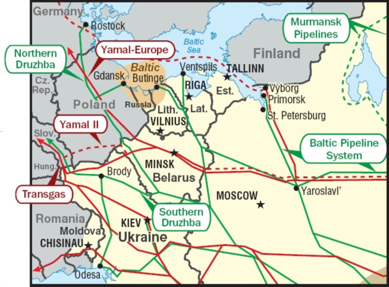 Схема магістральных нафтаправодаў ва Ўсходняй Эўропе: