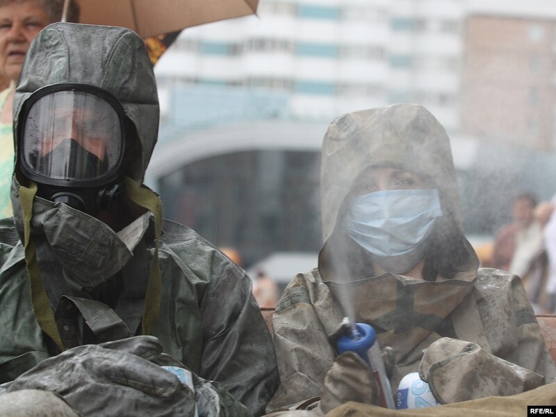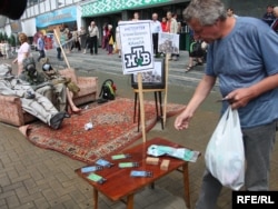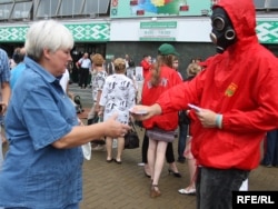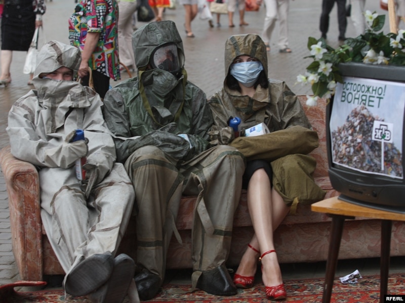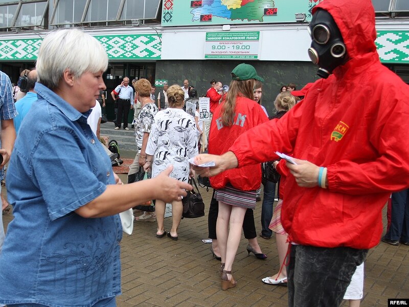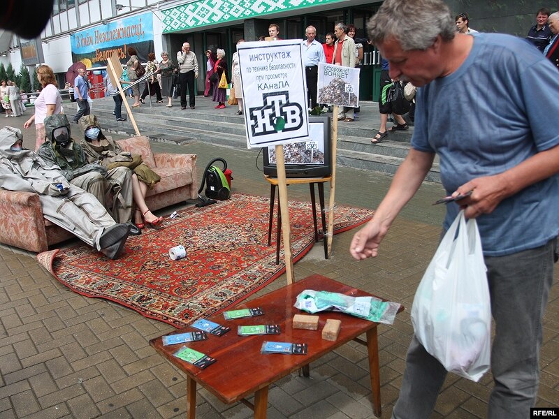 Удзельнікаў акцыі было ня больш за дзесяць. Яны паставілі на плошчы ля ўваходу на Камароўскі рынак тэлевізар, туалетную паперу, селі на канапу і распырсквалі асьвяжальнік паветра.