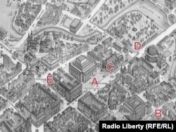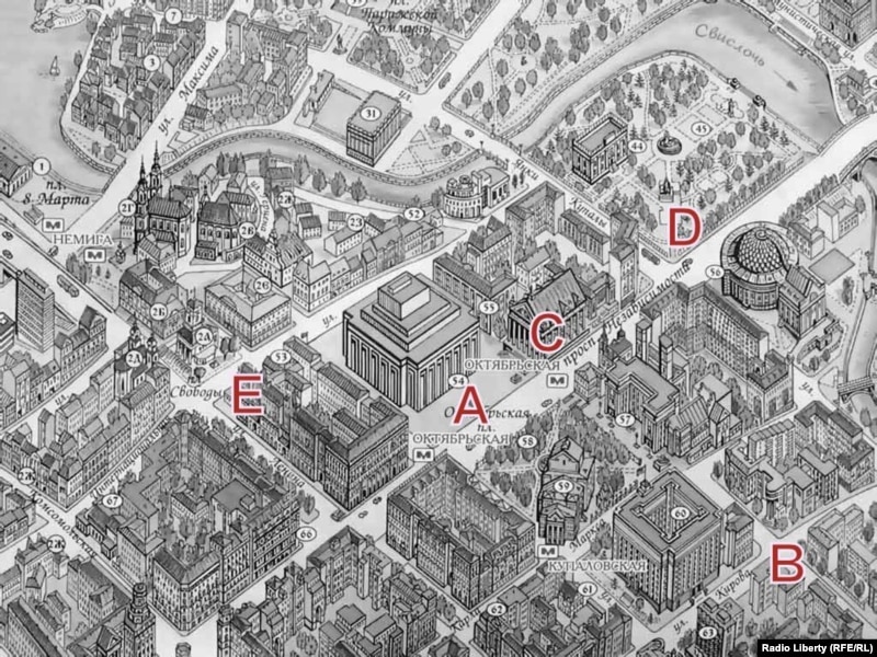 Мапа дзейнасьці Майстроўні ў цэнтры Менску: A – першыя Каляды 1980 году; B – месца сходаў на філфаку БДУ да пачатку 1983 году; C – месца сходаў у Палацы прафсаюзаў з 1983 году; D – месца масавых сьвятаў у парку Купалы; E – пікет пратэсту 13 чэрвеня 1984 году.