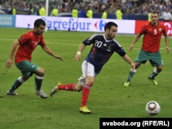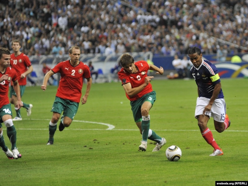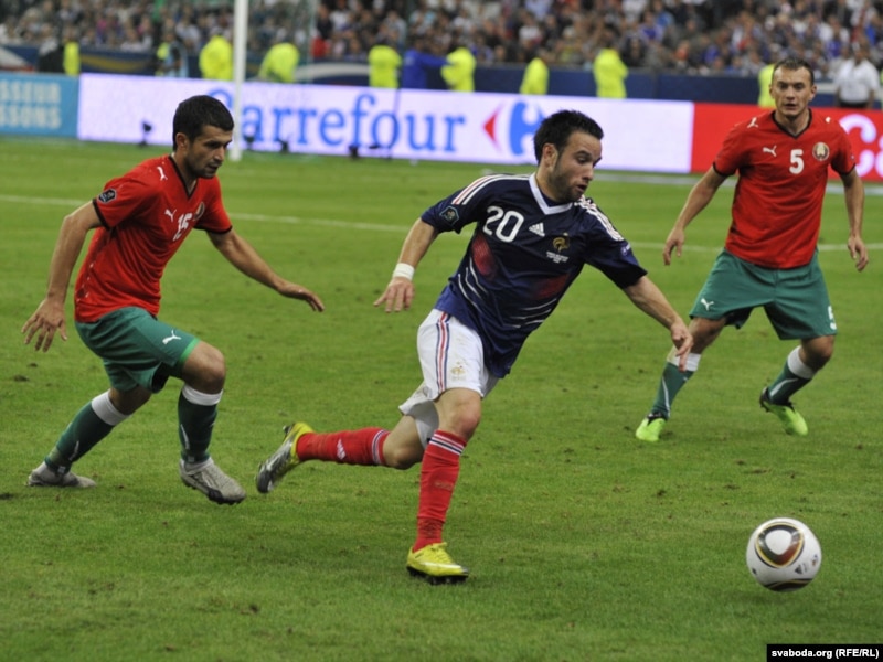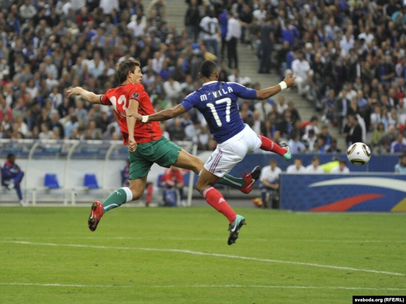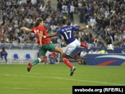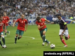 Сяргей Кісьляк ды Бакары Санья падчас матчу Францыя — Беларусь (0:1). Тут і далей — здымкі Алеся Шухера.