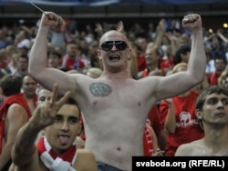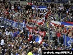 Беларускія фанаты на арэне «Стад дэ Франс». Іхняе «Верым, можам, пераможам» часам было чуваць нават на супрацьлеглай трыбуне.