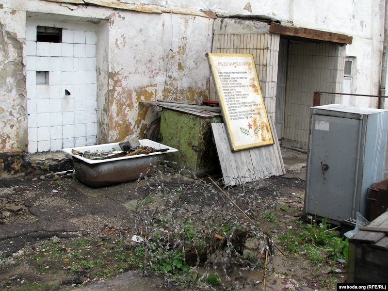 Ва ўнутраных дворыках вайскоўцы пакінулі тое, што не ўяўляла ніякай каштоўнасьці: ад старой сантэхнікі да пустых сэйфаў і нагляднай агітацыі