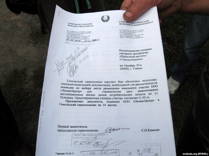«Мая задача — давесьці гэтыя дакумэнты да вас. Забраць потым гэтыя дакумэнты і завезьці ў праектны інстытут „Гомельгіпразем“, каб яны рыхтавалі гэтыя дакумэнты для кожнага з вас».