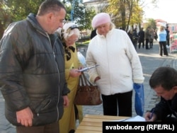 Спадар: «Я хачу паставіць свой подпіс за ўсіх кандыдатаў, каб яны маглі ўдзельнічаць у выбарах. Адна складанасьць — ня ведаю дзе гэтыя пункты, каб падпісацца».