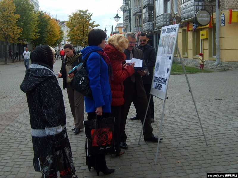 На той жа вуліцы Ленінскай разьмясьціўся й яшчэ адзін пікет. Тут зьбіраюць подпісы за трох патэнцыйных кандыдатаў адразу — Віталя Рымашэўскага, Міколу Статкевіча й Рыгора Кастусёва. На стэндзе надпіс: «Эўрапейскі выбар».