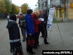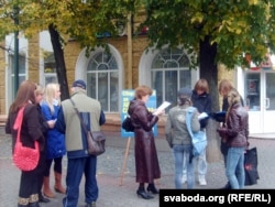 Спадар: «Хачу сказаць, што людзі цікавяцца выбарамі, падыходзяць да стэнду, чытаюць, але бачу, што пакуль яны ня вызначыліся, дый большасьць зь іх ня маюць пашпартоў — гэта яшчэ толькі пачатак збору подпісаў».