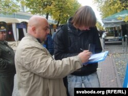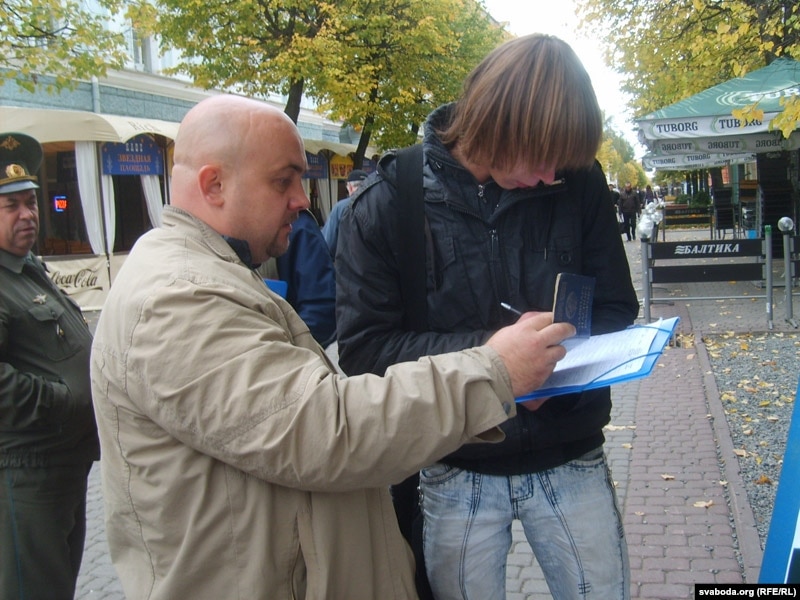 Яшчэ адзін спадар, паставіўшы подпіс за Яраслава Раманчука, падбадзёрвае зьбіральнікаў подпісаў.