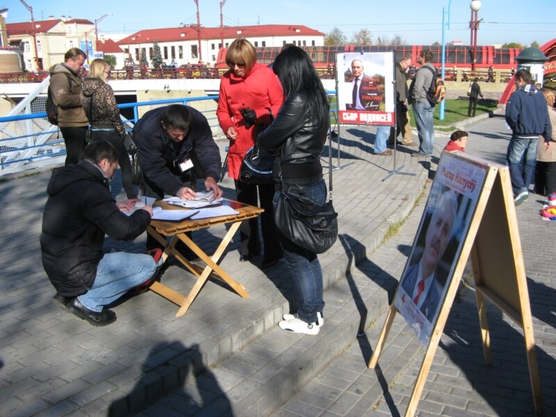 Вуліца Паліграфістаў у Горадні — шлях на Цэнтральны рынак або Скідэльскі — як яго некаторыя называюць па-старому. Дык вось: напачатку стаяць штодня, апроч панядзелка, зборшчыкі подпісаў у шэраг — за Саньнікава, за Някляева, за Кастусёва, за Раманчука. Некаторыя выбаршчыкі падпісваюцца за ўсіх чатырох, па чарзе. Але што мне гавораць хлопцы-зборшчыкі? Што праходзяць тысячы людзей, а подпісаў за дзень удаецца атрымаць семдзесят-восемдзесят. “Ніхто ні ў што ня верыць, нікому нічога ня трэба”.