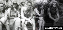 Майстроўня на археалягічных раскопах у Міры, лета 1982 году. Натальля Лазоўская, Арына Вячорка, Вінцук Вячорка, Лада Шчасная, Алесь Бяляцкі.